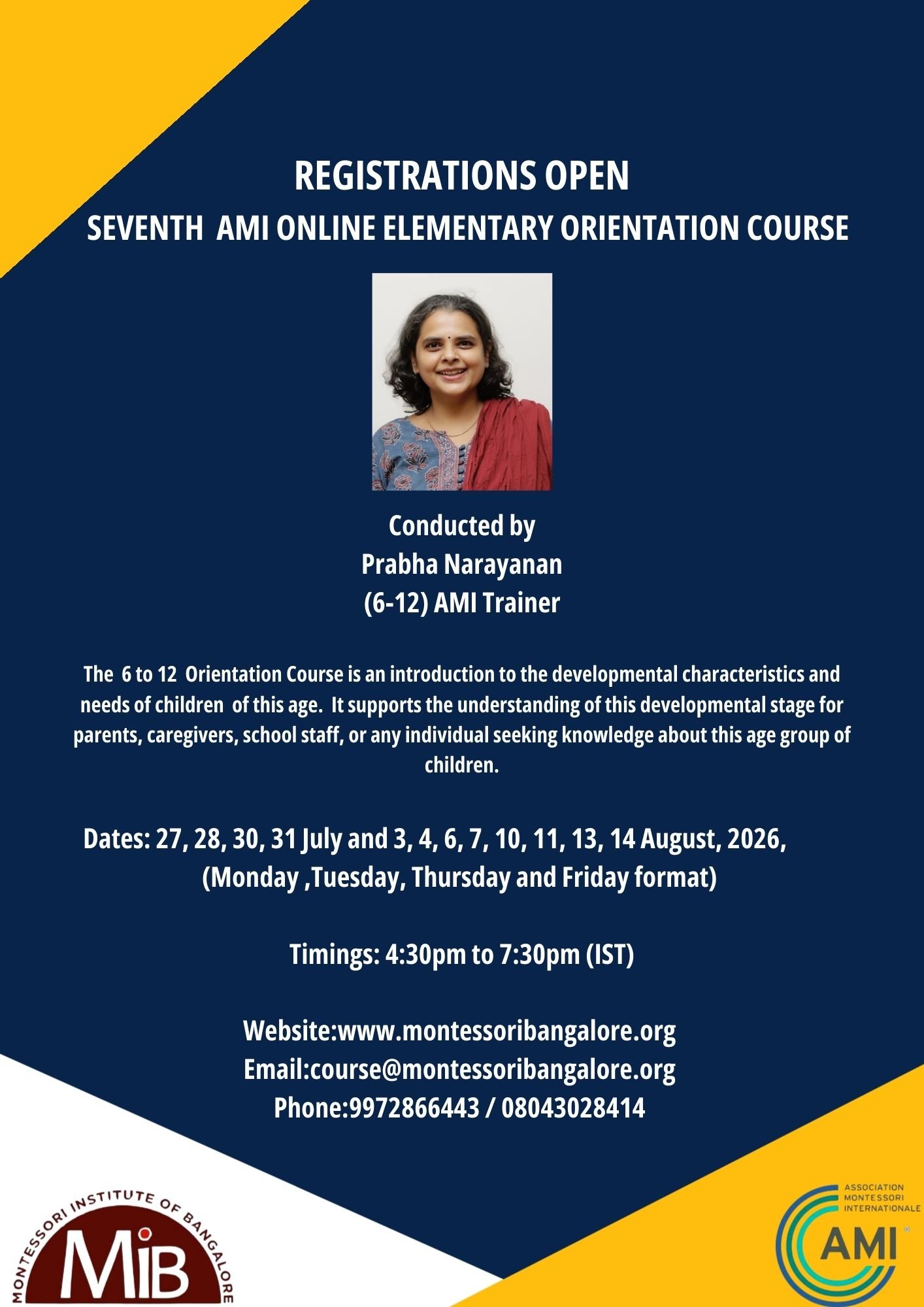Directed online learning in your own time, the asynchronous part, will include recorded lectures, videos, readings, student discussions and other exercises. Digital resources will be hosted by Montessori Institute of Bangalore. In addition to these, the student will need to do 9 hours of observation of children in this age group – either in a Montessori environment or other informal environment. More details will be given at the start of the course.COURSE DELIVERY